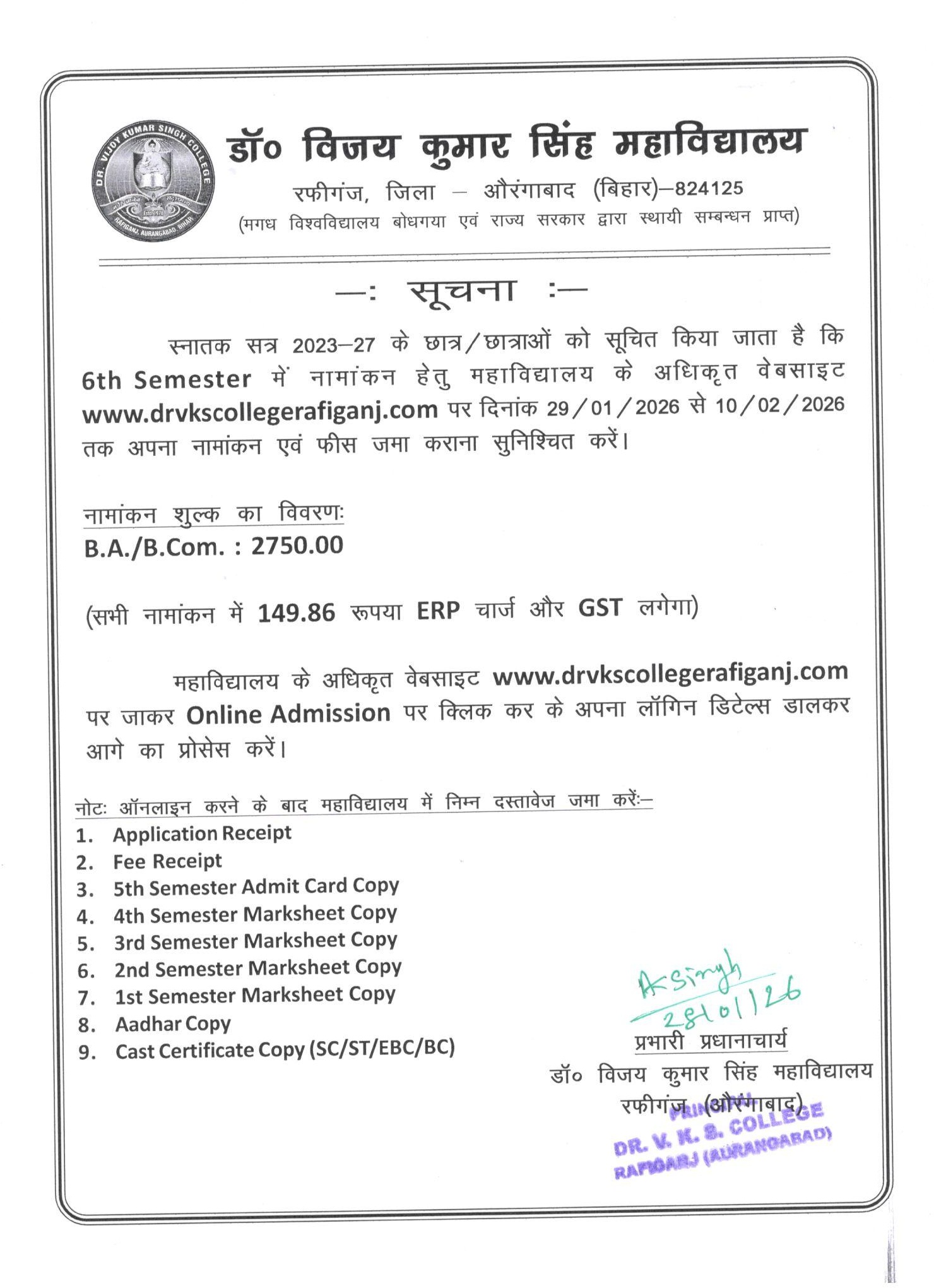 B.A./B.Com. 6th Semester Admission (Session 2023-27)